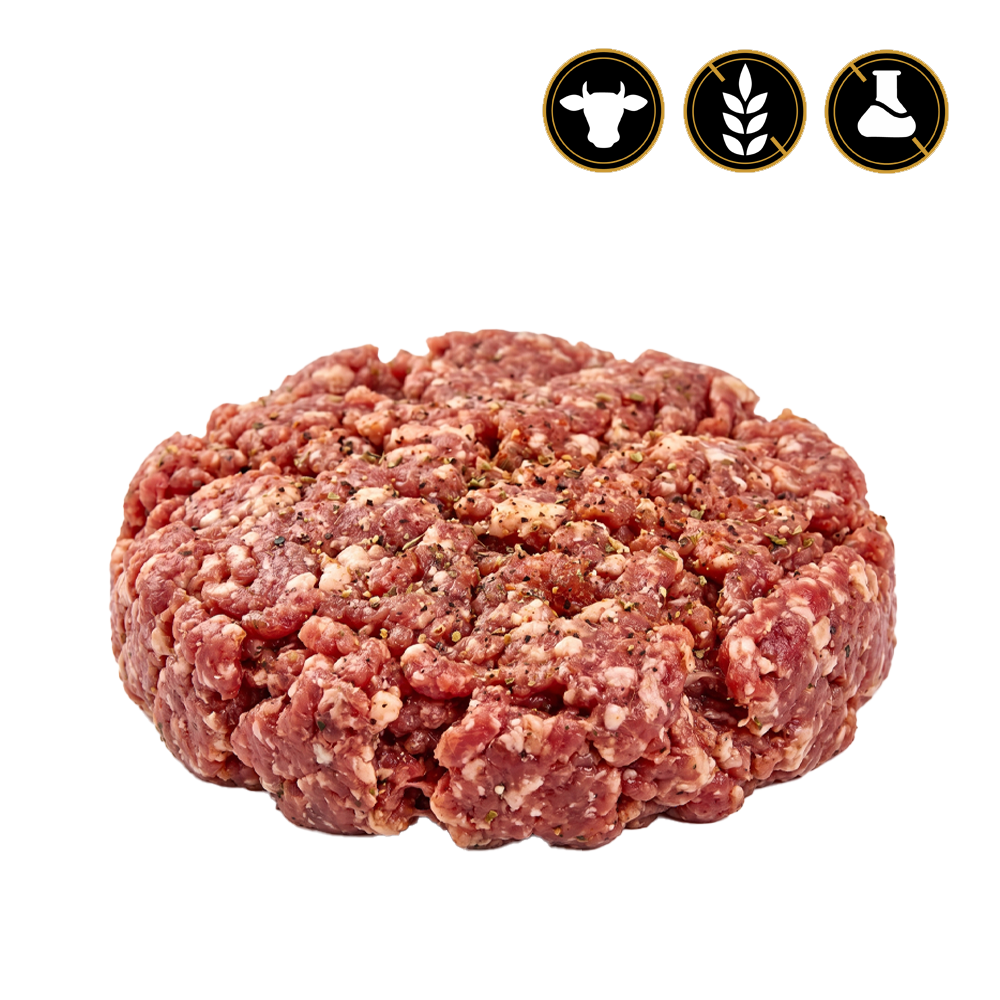 Descripción: Descubre el equilibrio perfecto entre sabor y textura. Nuestra mezcla exclusiva combina un 40% de ternera Angus, reconocida por su marmoleo único, con un 40% de carne de vaca seleccionada para aportar cuerpo y carácter. El 20% de grasa de calidad asegura una jugosidad excepcional en cada bocado, todo realzado con una mezcla secreta de especias que potencia las notas cárnicas sin enmascararlas.